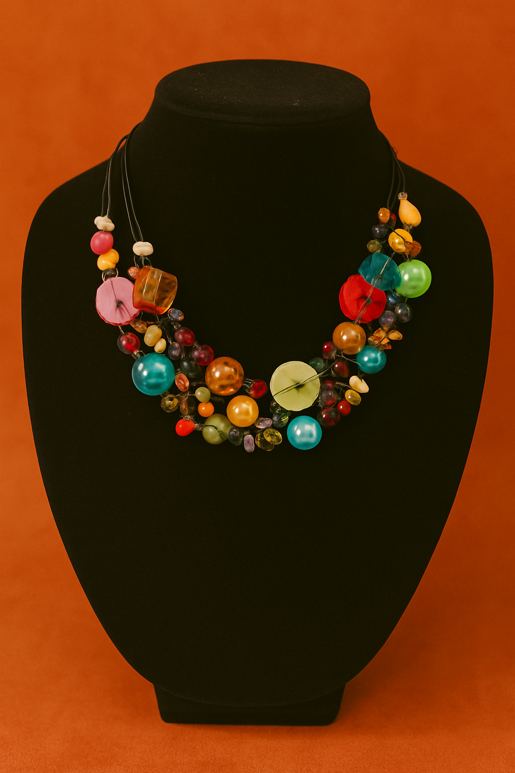 A playful explosion of color and texture, this whimsical necklace features oversized beads in every hue—from shimmering teal and fuchsia to golden amber and lime green. Faceted crystals, iridescent pearls, shell discs, and glass baubles are artfully strung on black multi-strand wire for a look that feels eclectic, joyful, and completely one of a kind. Perfect for adding a pop of personality to any outfit.