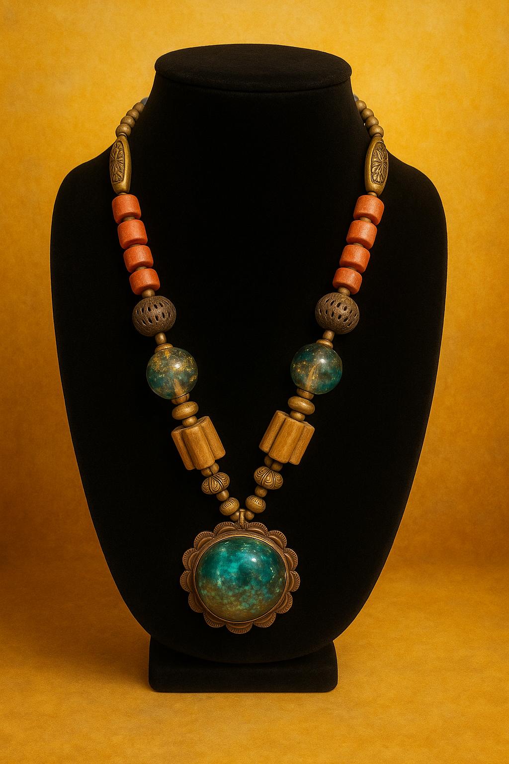 Mystical and mesmerizing, the Celestial Garden Necklace is a one-of-a-kind blend of earthy textures and cosmic shimmer. Featuring hand-painted globes, carved wooden beads, antique bronze accents, and a radiant pendant filled with iridescent flakes, this piece feels like a portal to another world.