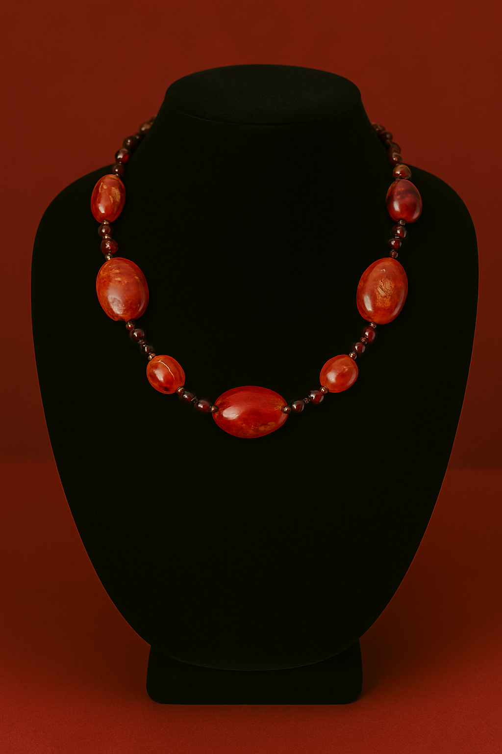 A fierce blend of deep red and burnt orange ceramic-style ovals, paired with faceted glass beads and black crystal accents. Crimson Flame is bold, bright, and designed for the woman who commands the room without a word.
