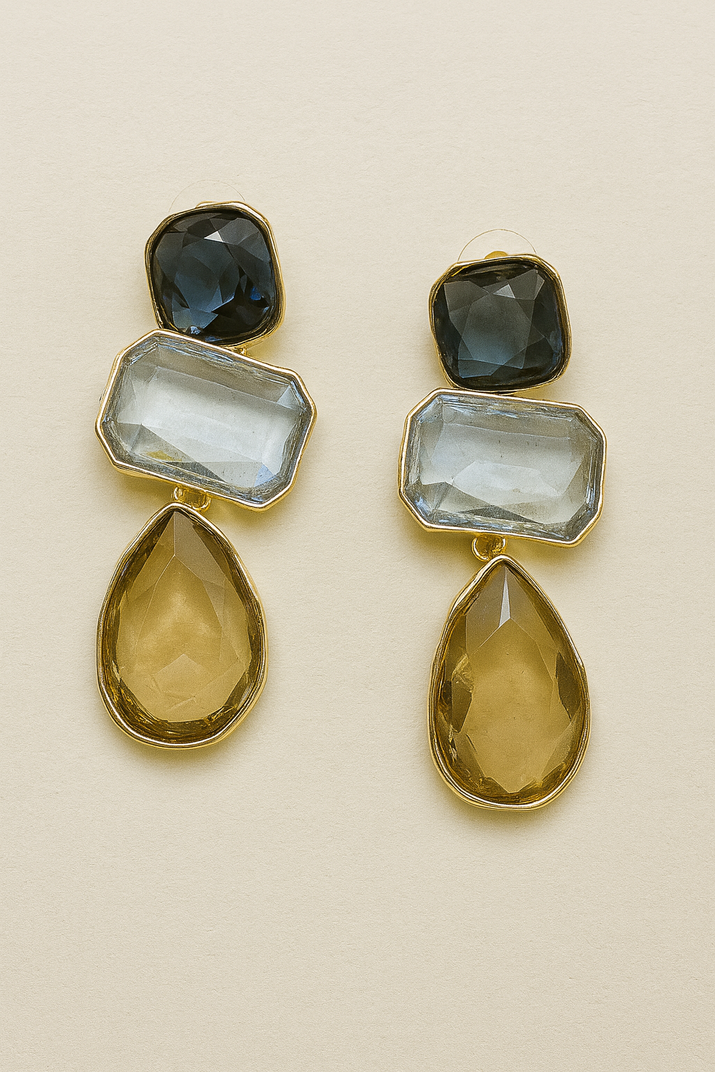 Elegant with a touch of wild, Desert Moonlight Cascades feature a trio of faceted stones in smoky bronze, icy clear, and deep midnight hues. Framed in soft gold and stacked like desert sky layers, these earrings shimmer with sunset soul and moonlit mystery.
