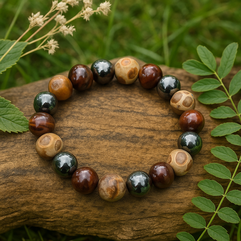 Rooted in calm and guided by light, this blend of petrified wood, hematite, and tiger’s eye restores balance, focus, and inner strength.