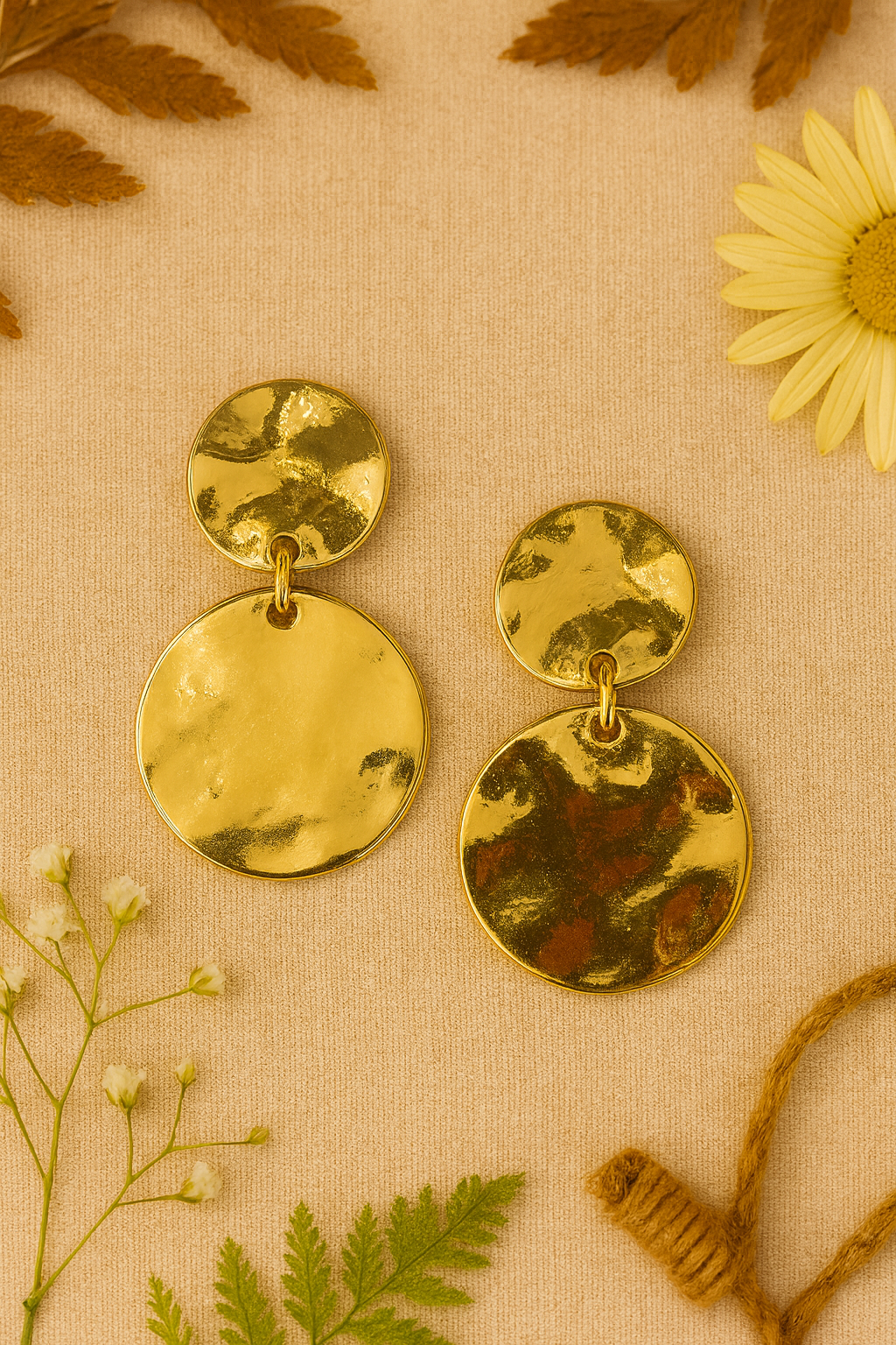 The Golden Aura Drops embody radiant energy and effortless beauty. Their bold, hammered finish reflects light with every movement, symbolizing confidence and the power to shine from within. A timeless boho statement for any look.