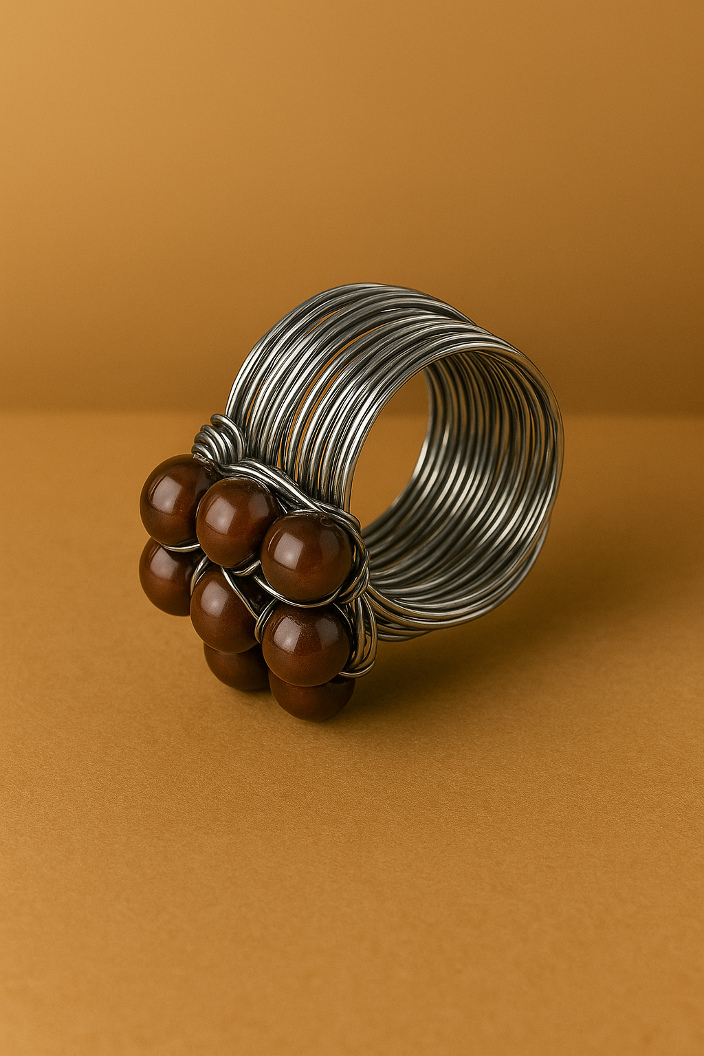 The Midnight Cluster Ring features a sculptural design made from interwoven silver-tone wire adorned with glossy black glass beads. Bold, textured, and unexpectedly chic — this ring brings modern edge and playful elegance to your fingertips.
