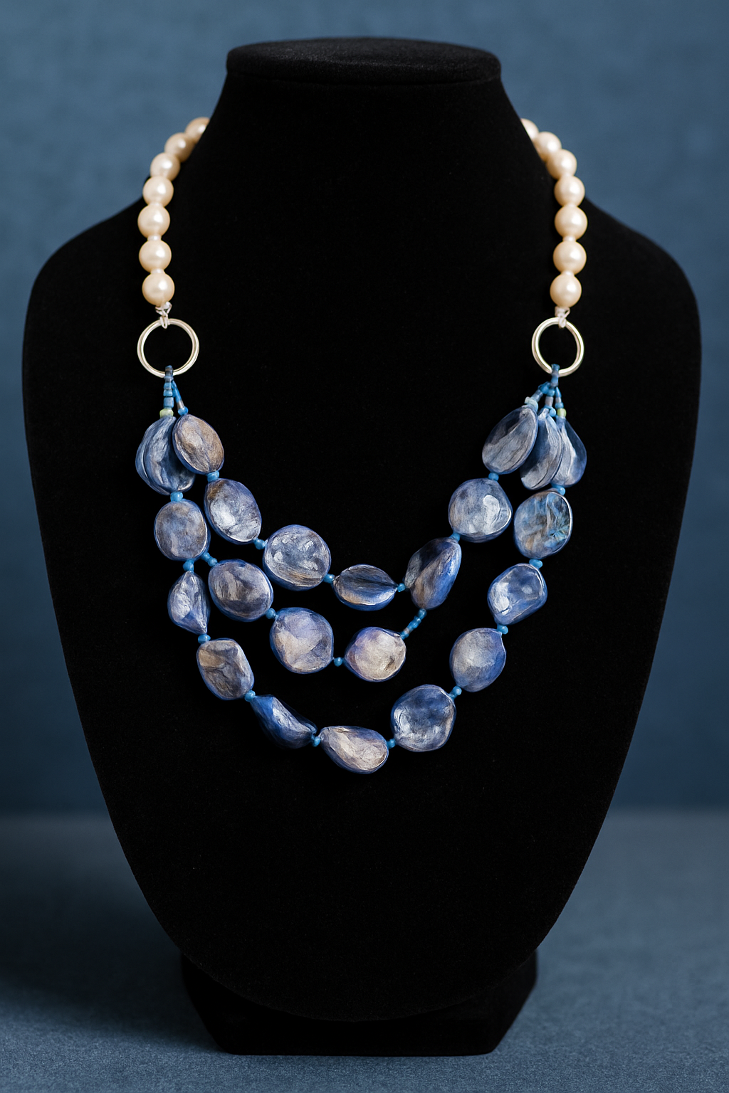 Dripping in celestial shimmer, Moonlit Mirage is a dreamy double-strand necklace crafted from luminous coin pearls in silvery violet and oceanic hues. Each iridescent pearl glows with a moonlike sheen, while smaller accent beads and silver-toned rings add a soft modern twist. Lightweight yet captivating, this piece radiates lunar magic—perfect for the boho soul drawn to the sea, stars, and the sacred feminine.