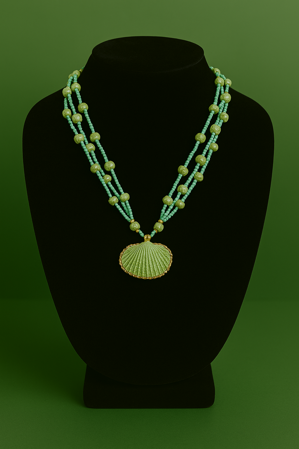 Feel the call of the coast with Seaside Royalty — a stunning green beadwork necklace crowned by a regal seashell pendant wrapped in gold accents. This layered beauty captures the spirit of ocean air and goddess energy, bringing a fresh yet timeless elegance to your neckline. From beachside brunches to summer soirées, this piece is your passport to effortless, oceanic glam.