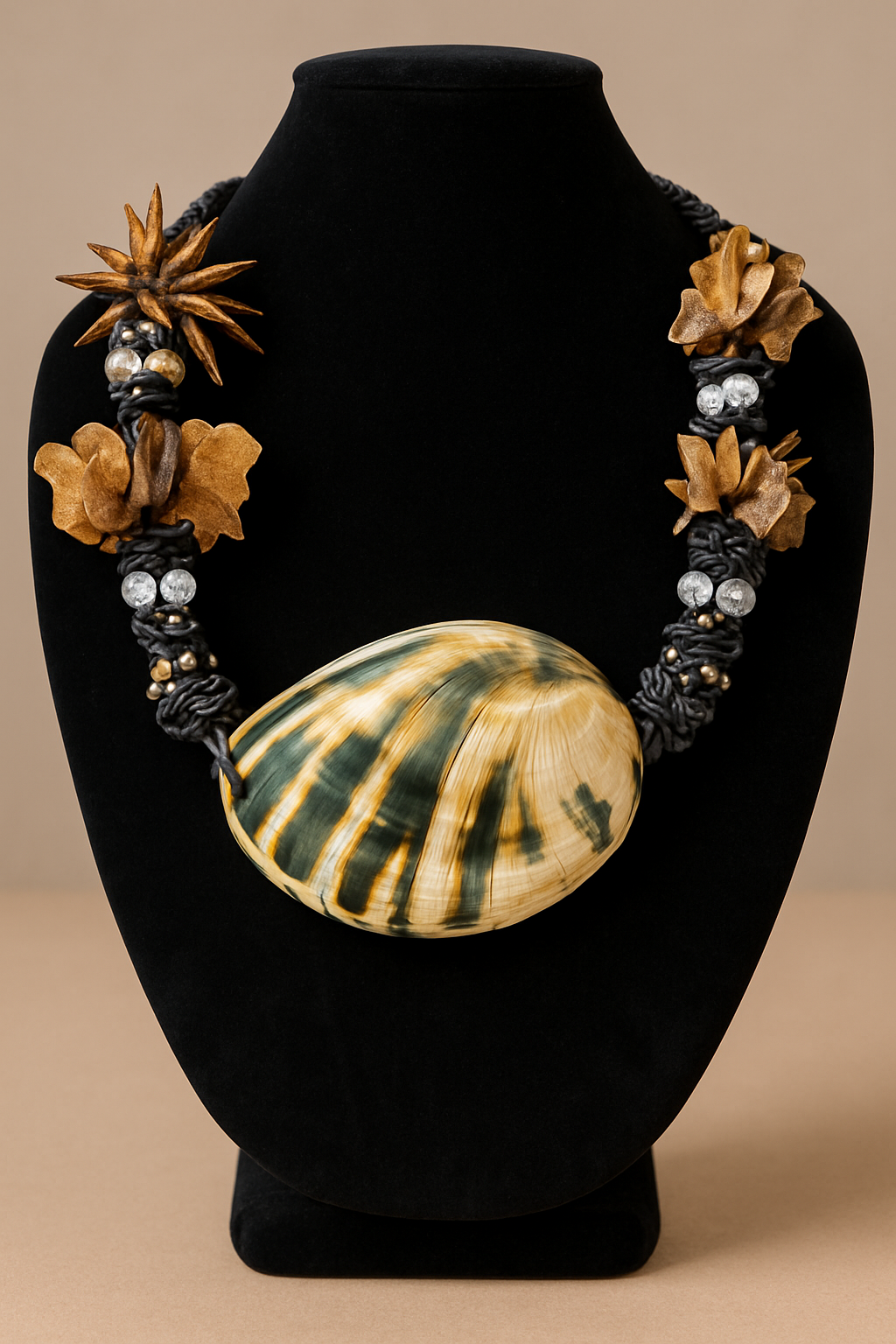 Rooted in nature, kissed by the tide — the Shellbound Spirit Necklace is a soulful tribute to the sea. Its oversized, hand-selected shell centerpiece glows with natural striations, anchored by twisted charcoal cording and crowned with wildwood accents and golden seed beads. Each detail feels like a treasure plucked from coastal dreams, perfect for the grounded goddess who walks with ocean energy and earth wisdom.