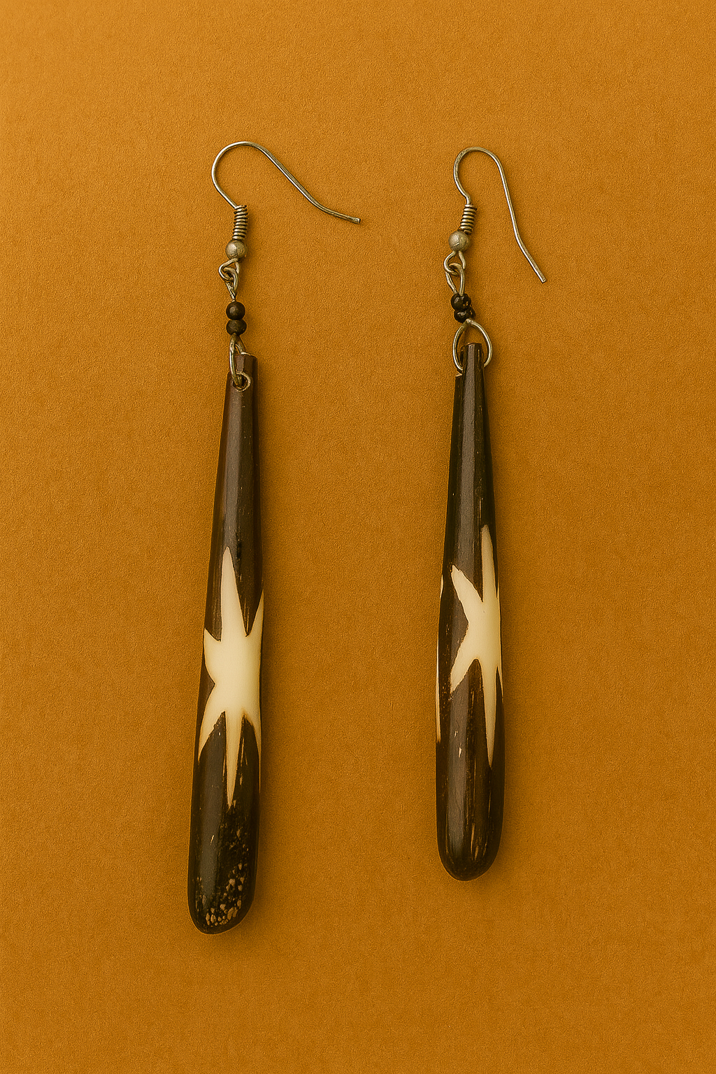 Wanderlust carved into wood — these elongated earrings feature hand-carved starburst patterns that radiate tribal charm and celestial energy. Lightweight and earthy with bold intent, the Starlight Nomad Drops are made for movement, moonlit nights, and soulful expression.