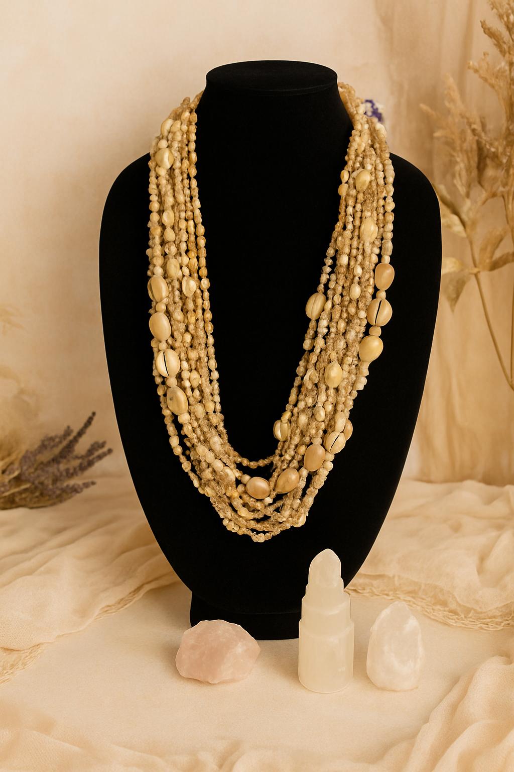 A one-of-a-kind statement necklace featuring 13 hand-strung strands of natural shells, polished stones, and vintage coastal beads. Earthy, elegant, and deeply bohemian—this layered piece channels the healing energy of the sea and the bold beauty of coastal goddesses.