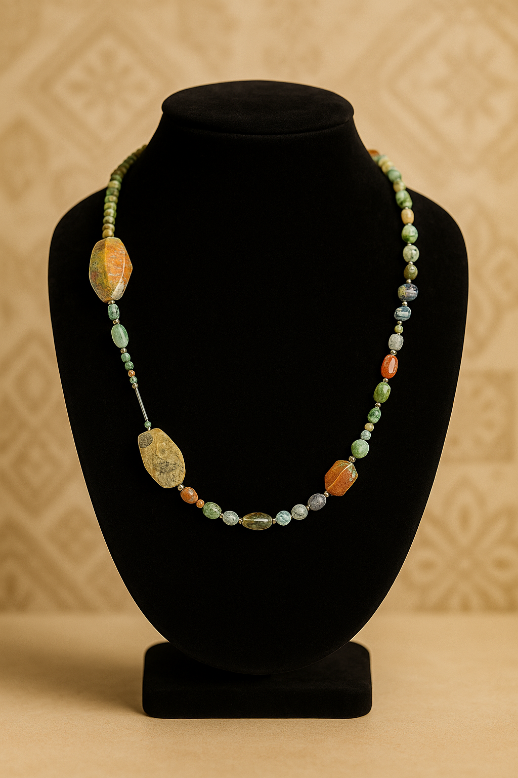 Every stone tells a story in Wanderer’s Way — an asymmetrical journey of earthy tones, textured gems, and bold natural shapes. This one-of-a-kind necklace is a mosaic of polished agate, jasper, and quartz, each piece offering grounding energy and bohemian elegance. It's a wearable map for the soul, perfect for the woman who's always evolving, always exploring.